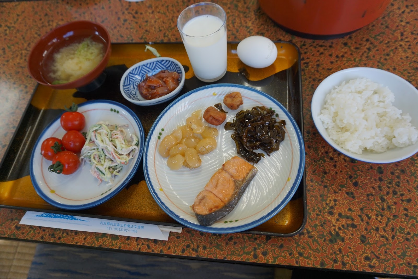 完整的日式自助早餐,有飯、鮭魚、醃漬菜、蛋、湯,菜色還可以。